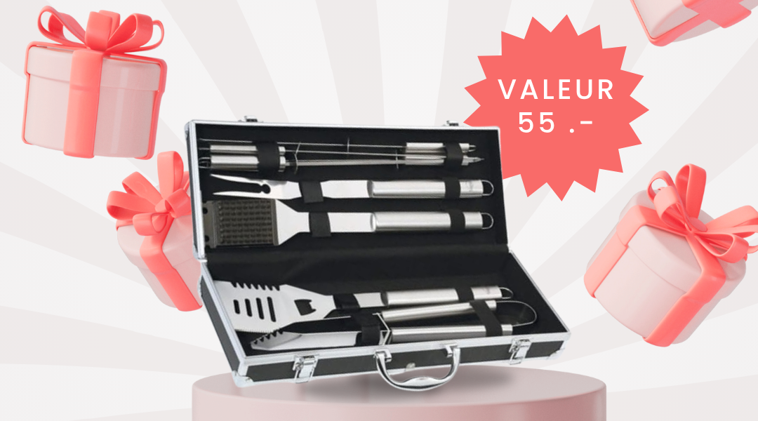 Pour fêter l’arrivée imminente des beaux jours, je te fais gagner ce superbe Set Barbecue PHOENIX en mallette de la marque Küchenprofi ! Tout ce dont tu as besoin pour devenir le roi ou la reine des grillades est à l’intérieur (8 pièces au total) :